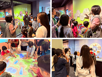 隨後前往大園尖山考古展示館,導覽老師以生動的開場,介紹尖山遺址的發現歷程。早在1931年,大園國小整地時意外挖出形狀各異的石塊,引起關注;戰後經研究確認為遺址,卻直到2007年才獲得正式保存。歷經數十年,從校舍整建到桃園航空城開發階段,陸續出土近十萬件新石器時代文物。由於桃園屬台地地形,先民多聚居於海濱或河畔,隨著其居住地的地勢隆起,進而留下生活遺跡。值得一提的是,出土文物多為破碎狀態,推測為先民日常丟棄的器物,因深埋於垃圾坑中,得以長久保存,為我們揭示了史前生活的多樣風貌。館舍雖不大,卻透過互動裝置、動線設計與圖文展示,使大家在觀察與操作中體會到尖山遺址不僅是靜態的文物收藏,更承載著「圓山文化」與「植物園文化」互動的重要印記,也讓人進一步認識到其作為臺灣北部重要史前文化遺址的珍貴價值。
