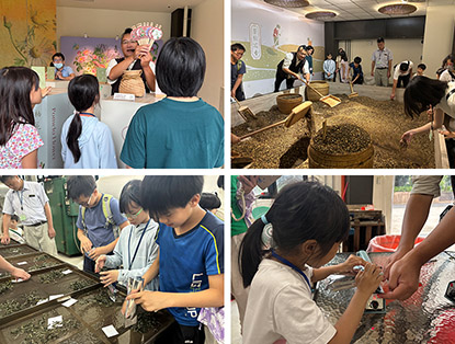 在等待茶葉乾燥的空檔,一行人由茶文化館經理帶領參觀茶產業歷史迴廊並解說具異國風情的東、西方花茶特展區,見習生們亦透過觸摸、翻攪展場的大量乾燥茉莉花苞,模擬將茶葉與茉莉花瓣混合的窨花工藝,體驗六零年代盛極一時的外銷茉莉花茶製作現場。活動接近尾聲,大家回到製茶區進行包裝作業,原本量多到需雙手捧起的一心二葉,雖然在烘盤網片上只剩少量的乾縮灰白條狀綠茶,但眾人對日後沖泡時將綻放的清香鮮爽仍滿懷期待,並希望於下次見識之旅能再品嚐美好的台灣風味。